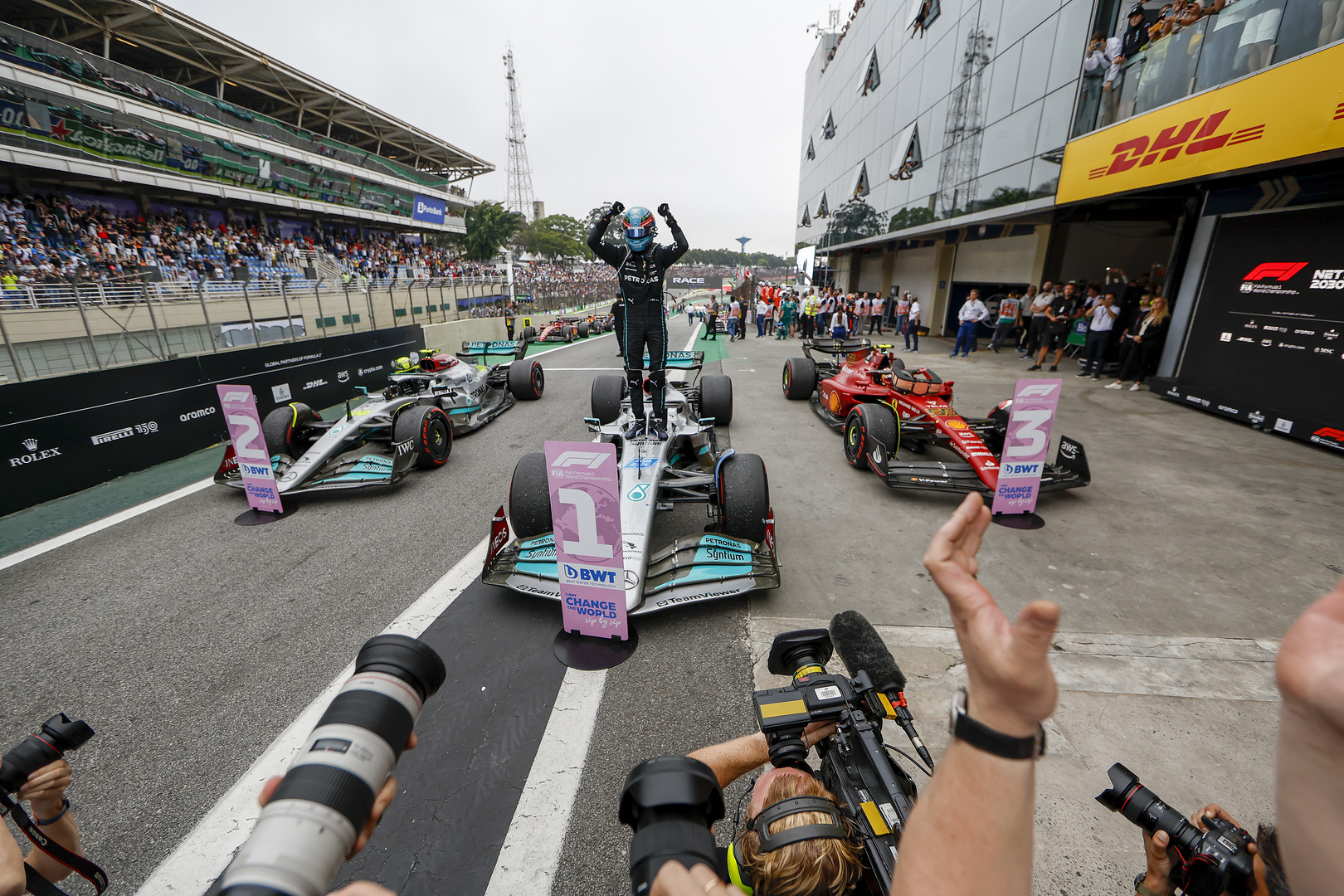 Russell’s first win was an emotional affair for all the right reasons, but it was especially poignant because he was on his own in Brazil, as his family and girlfriend Carmen had not made the long haul to Interlagos.