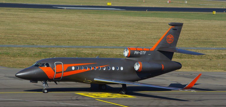 Verstappen acquired his 15-year-old Falcon 900EX in 2020 on the second-hand market. The plane is decked out in matte dark grey with orange graphics featuring the Verstappen logo.